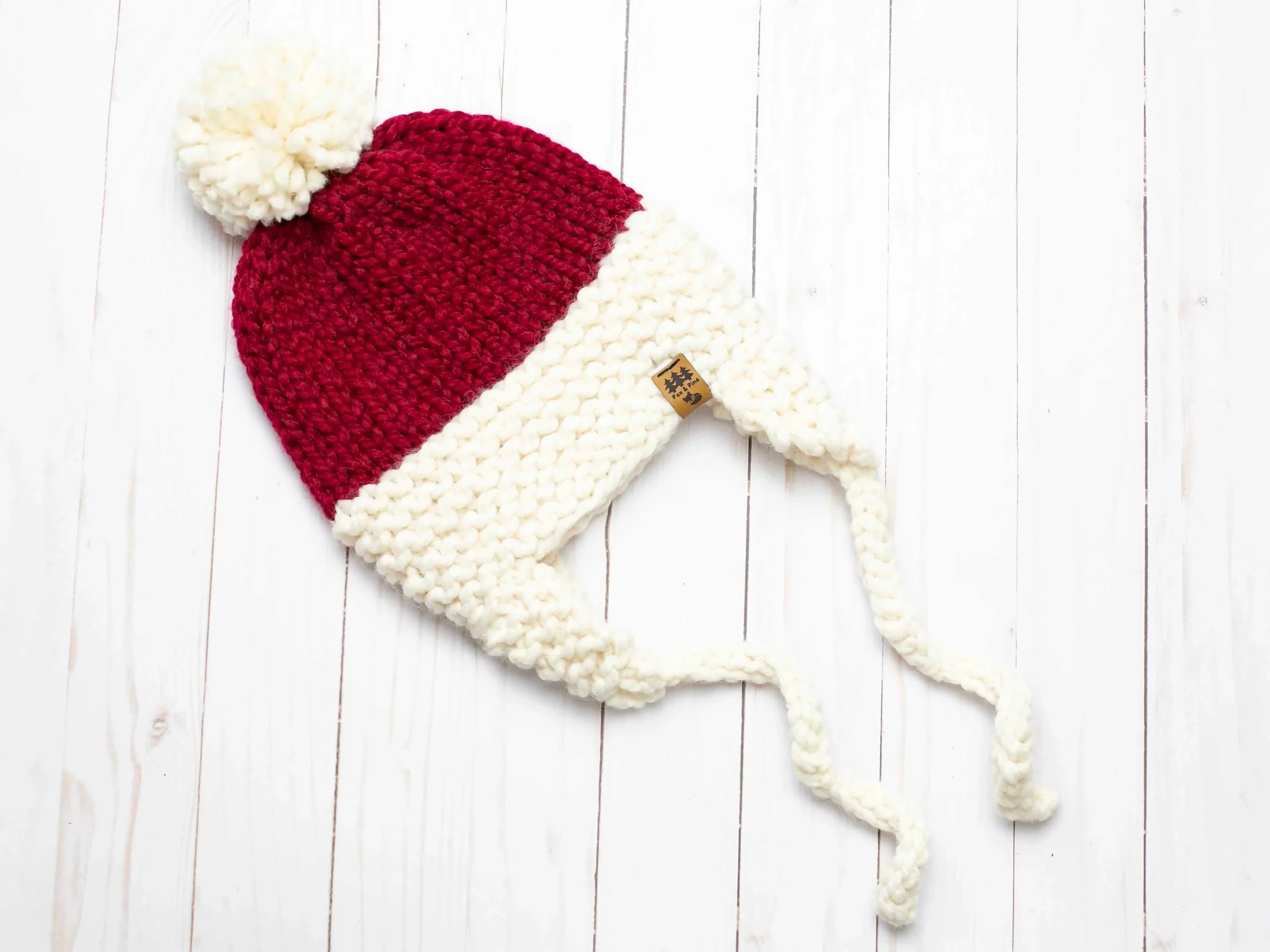 So many ways to describe this fun Christmas themed hat - aviator, trapper, ear flaps. Our sweet pompom hat knitting pattern is perfect for making handmade gifts for your loved ones, young and old. Comes in sides baby, children and women. The pattern includes directions for the Santa and Christmas stripe styles.