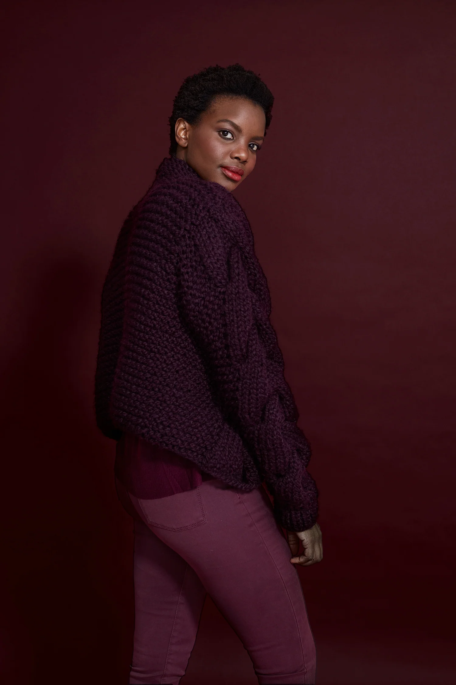 The Clusterwell Cardigan is a knit cardigan pattern made with super bulky weight yarn that has a skill level of intermediate.