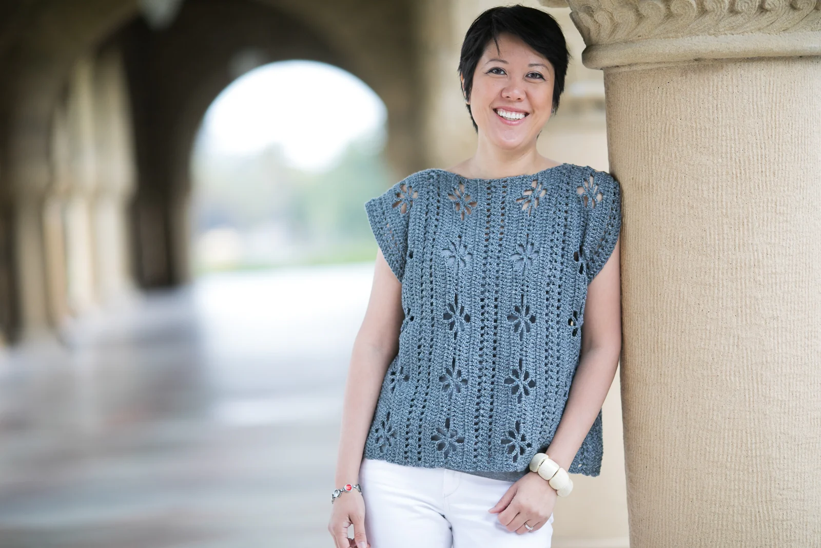 In the Wildflowers Tunic, poppy stitches and eyelets are repeated to create a sweet lacy-but-not-too-lacy top. With its customizable design, you can work it up fast and then wear it anywhere: date nights, the office, or lengthen it to wear as a cover-up at the pool!