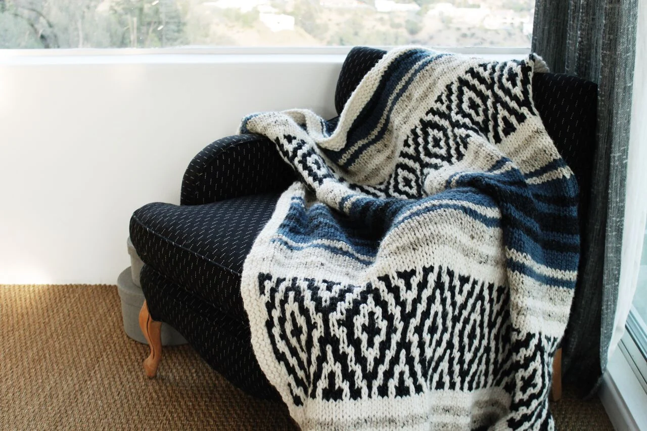 The Knit Kit - Mexican Blanket is a knit blanket kit that uses super bulky weight yarn and has a skill level of intermediate.